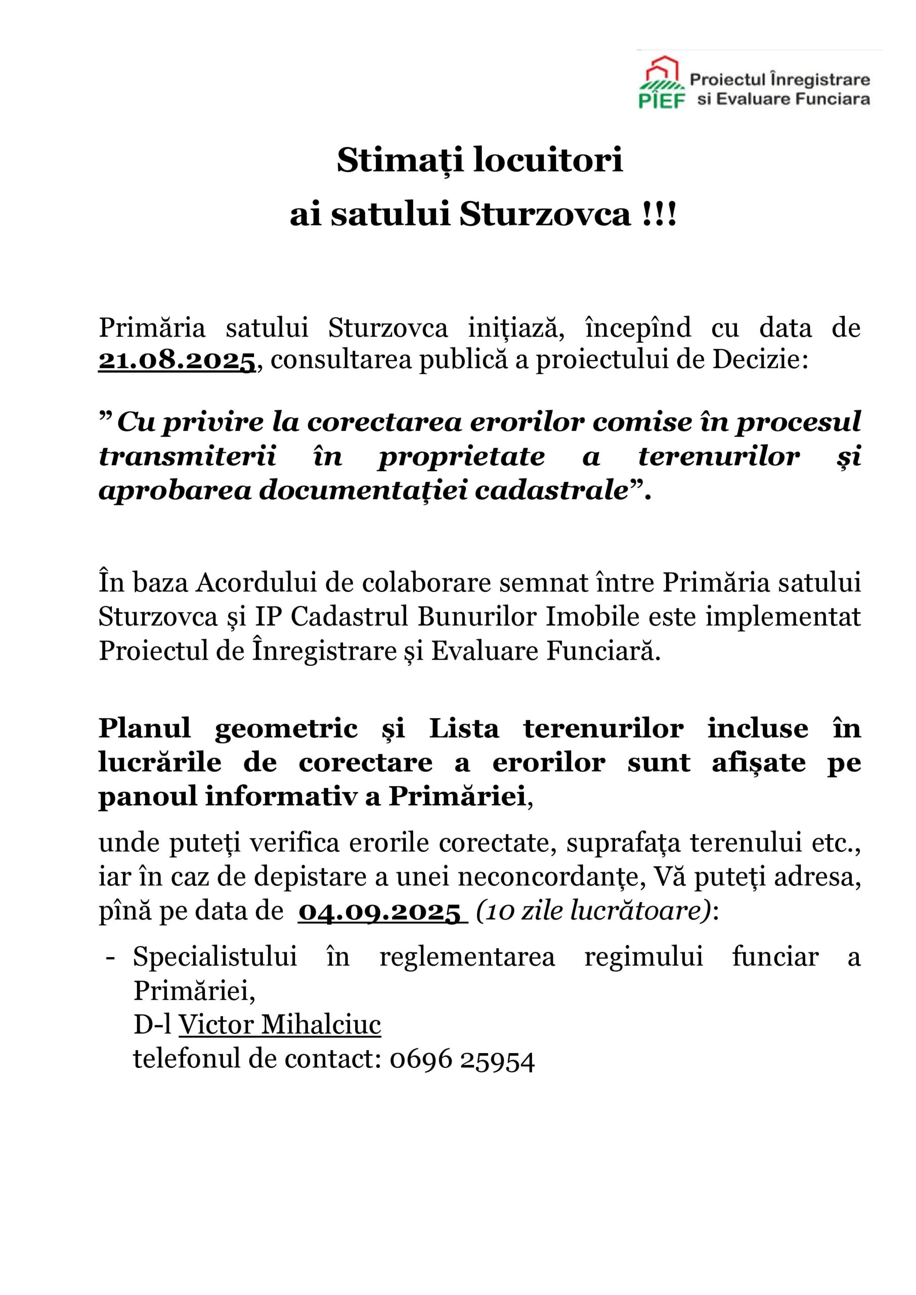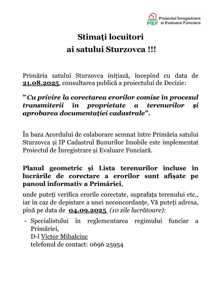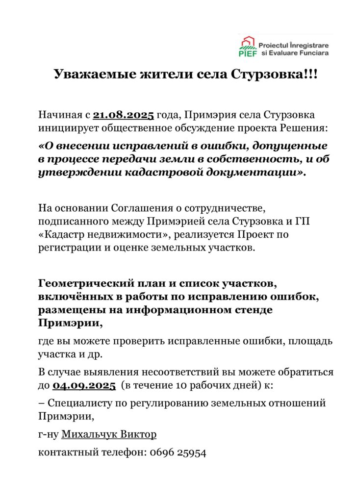 Примэрия села Стурзовка инициирует общественное обсуждение проекта Решения