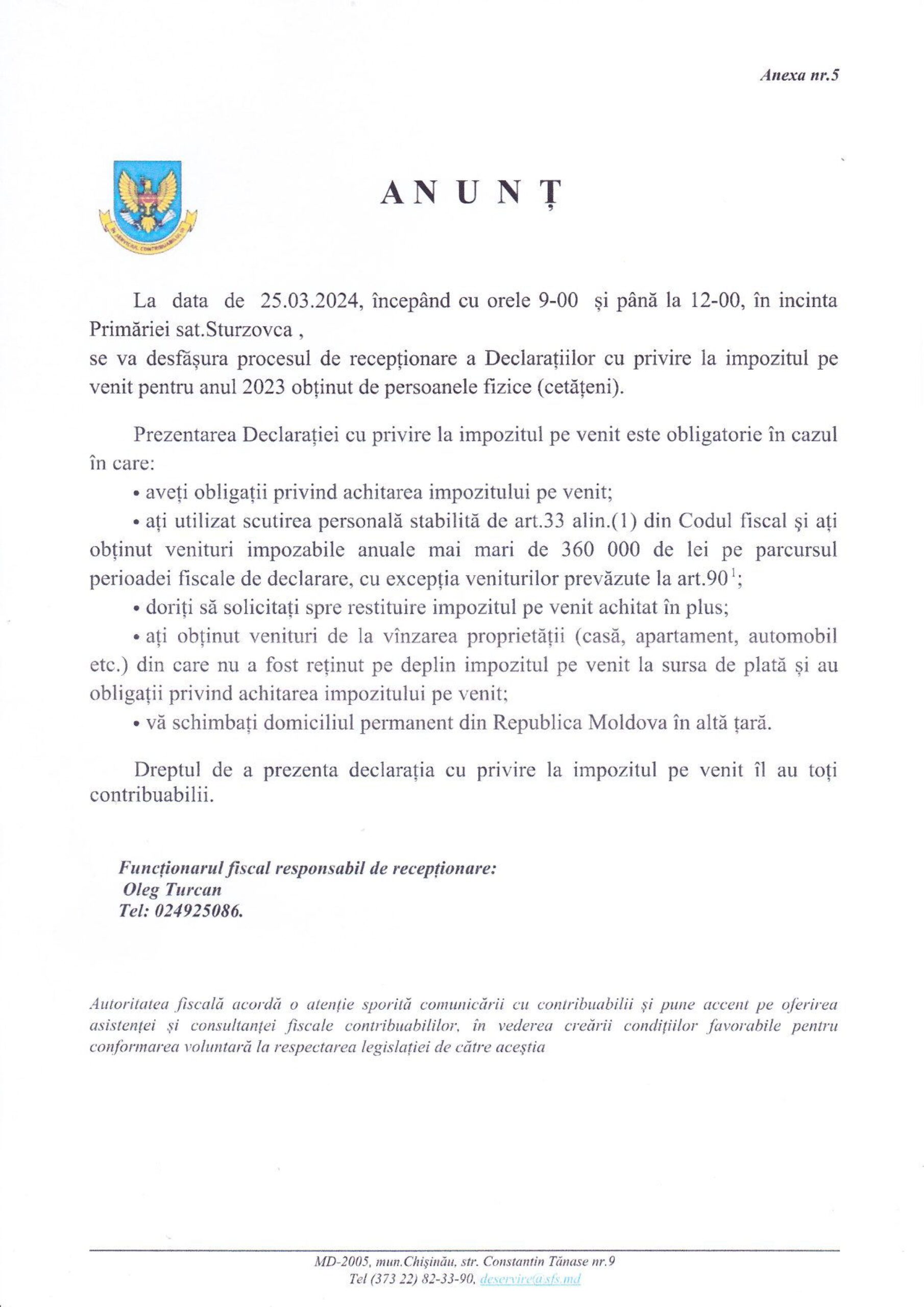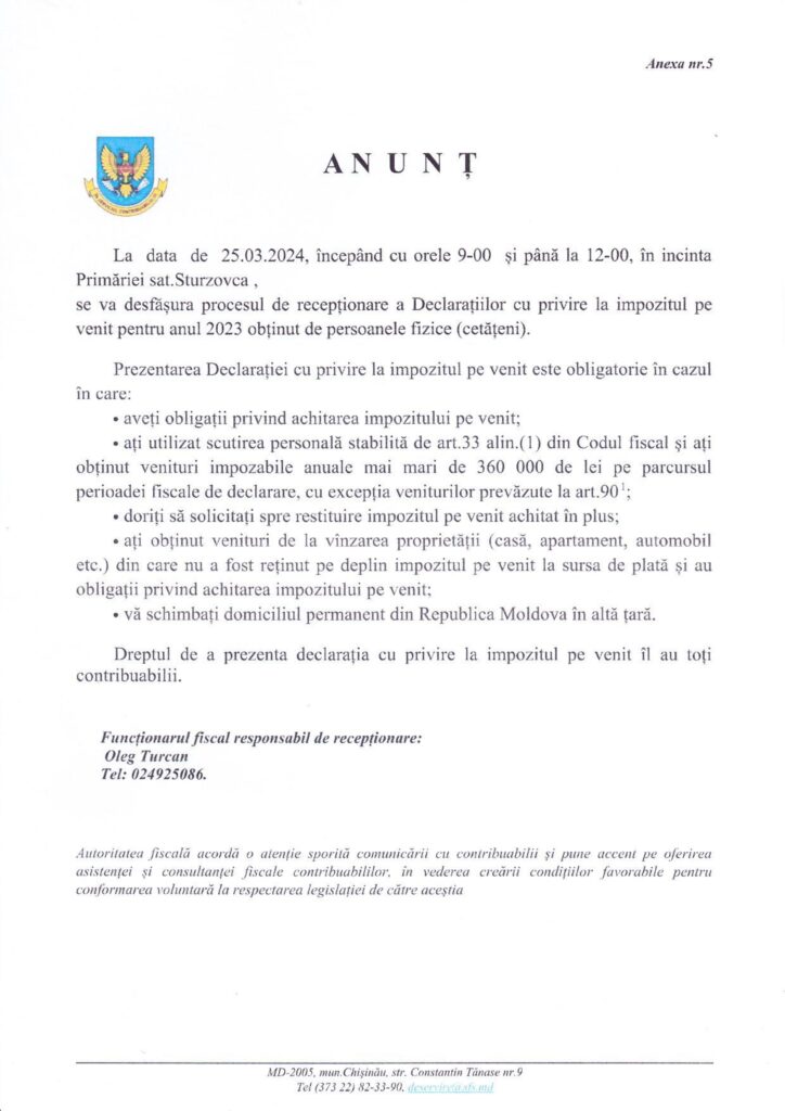 Procesul de recepționare a Declarației de privire la impozitul pe venit pentru anul 2023